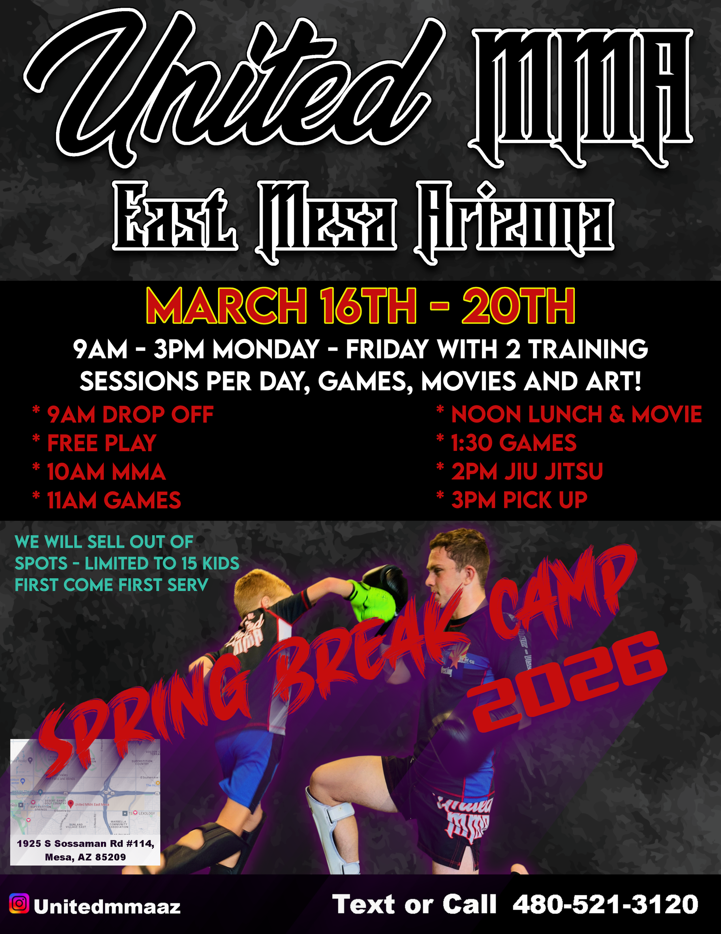 Spring MMA Camp March 16th - 20th / 9am - 3pm. We will have 2 training sessions per day, MMA and Jiu Jitsu. Free play time, designated game time, a kids animated movie, we will have times for talks on bullying, health, perseverance, nutrition etc. Finishing up the days with some Nogi Jiu Jitsu.